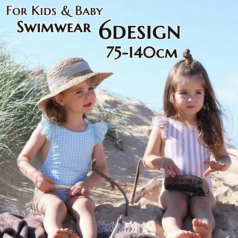 水着 スイムウェア ワンピース スイムキャップ付き 子供用 キッズ ベビー 赤ちゃん 女の子 ストライプ柄 ギンガムチェック柄 フリル 穴あきレース