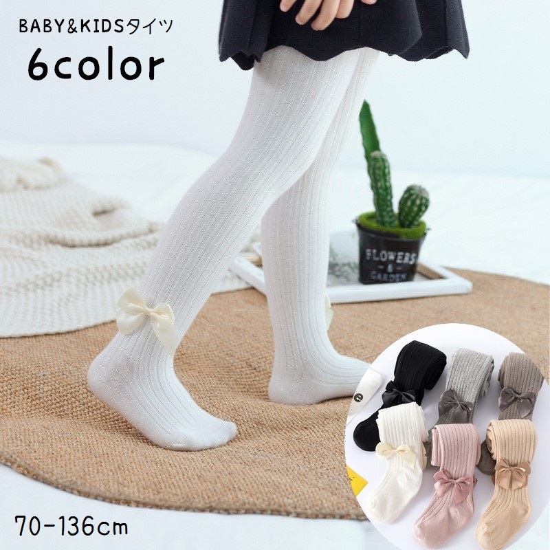 タイツ キッズ 子供服 ベビー 赤ちゃん レッグウェア 女の子 リブニット リボン ウエストゴム あったか 防寒 単色 無地 かわいい ガーリー キュ