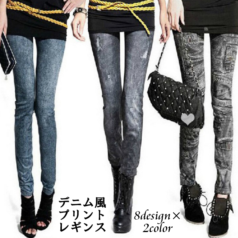 レギンスパンツ レギパン レディース ボトムス デニム風 ダメージ加工 プリント ストレッチ スキニー風 フェイクデザイン 薄手 おしゃれ かっこいい