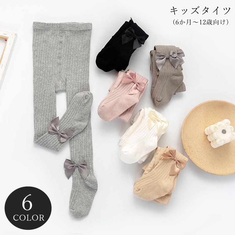 タイツ キッズ用 子ども用 子供用 女の子 レッグウェア 靴下 くつした くつ下 厚手 リボン リブ生地 無地 ホワイト ブラック ピンク ベージュ