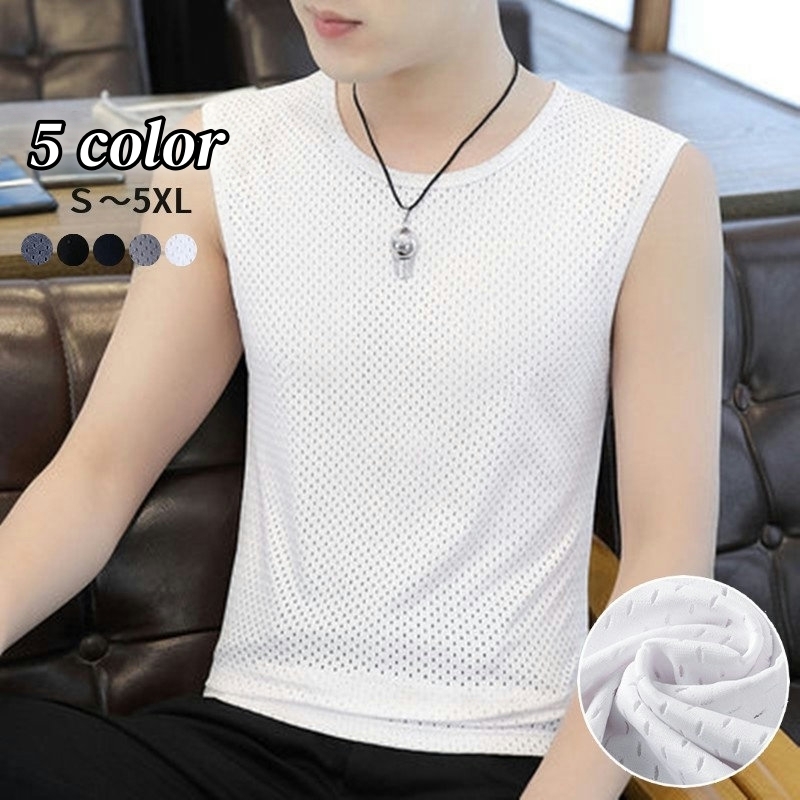タンクトップ メッシュ ノースリーブ トップス メンズ 男性 紳士 ラウンドネック 通気性 無地 単色 シンプル スポーツ フィットネス 大きいサイズ