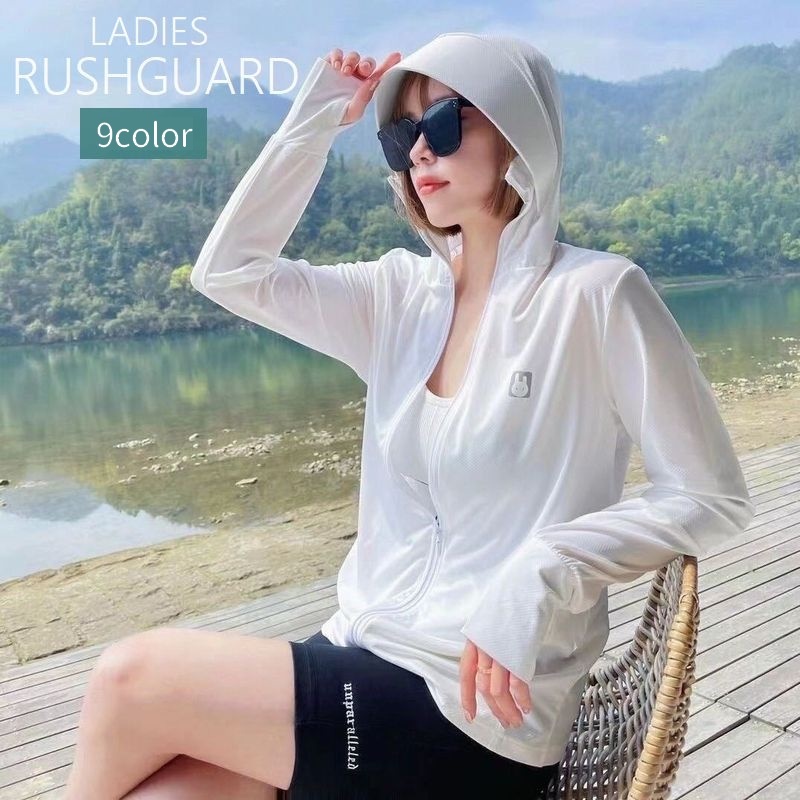 ラッシュガード レディース パーカー 長袖 ジップアップ フード付き 指穴付き 薄手 ハイネック ワンポイント スポーツ アウトドア シンプル おしゃ