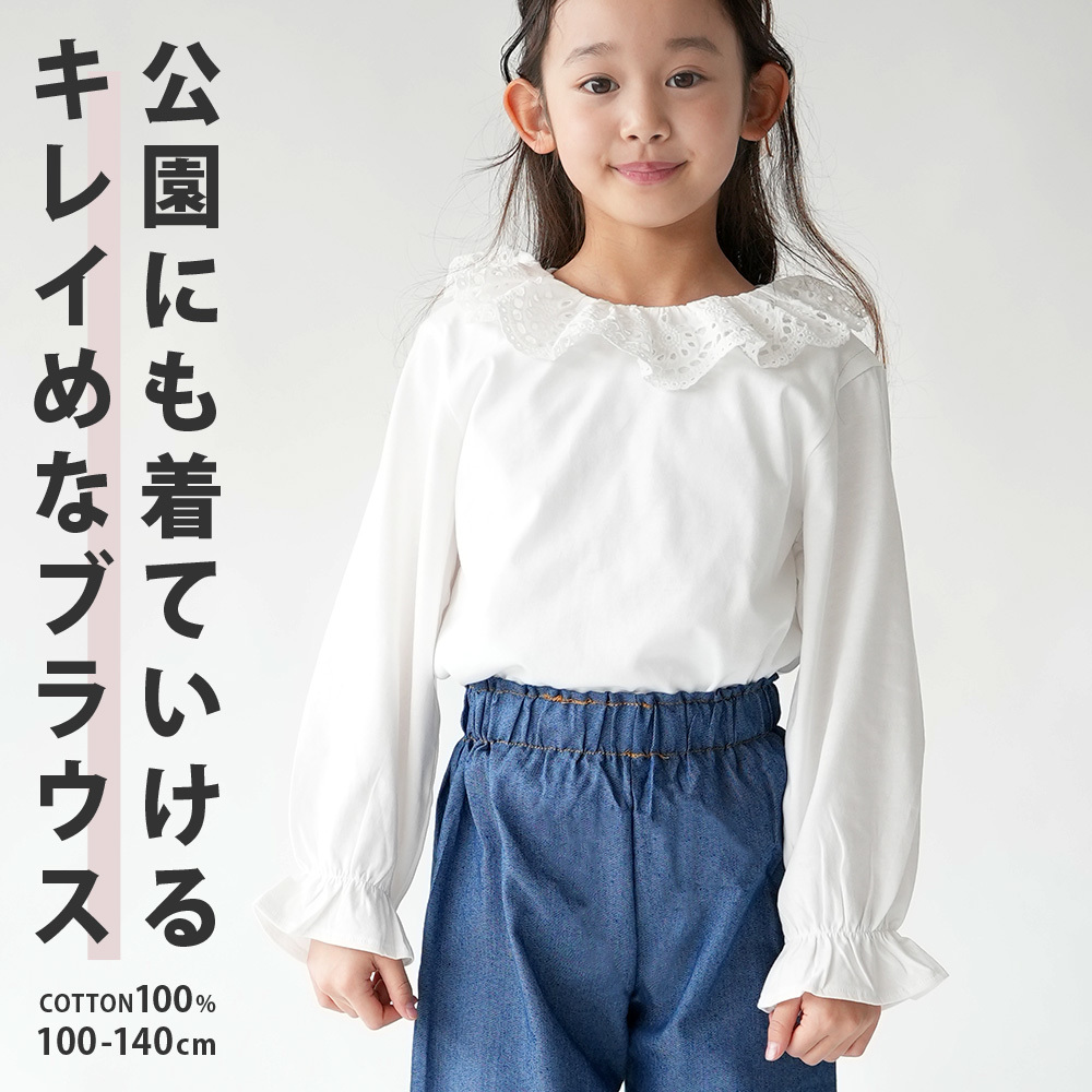 在庫処分 SALE ブラウス 子供服 トレンド 襟レース 丸襟 ビッグ衿 入学式 卒業式 発表会 お嬢様コーデ 綿100 コットン パフスリーブ フリ