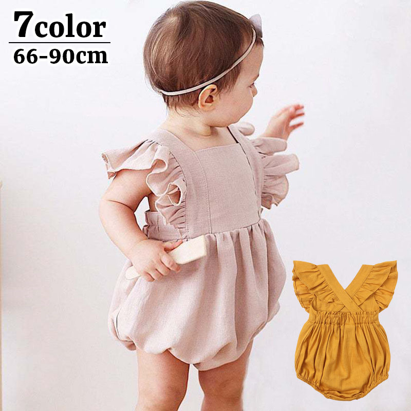 ロンパース ベビー 赤ちゃん 子供用 つなぎ ボディスーツ 肩フリル ふんわり 袖なし ノースリーブ 股下ボタン 無地 単色 ナチュラル おしゃれ か