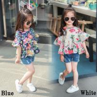 ブラウス キッズ 女児 女の子 半袖 クルーネック フレア袖 スレア裾 花柄 ホワイト ブルー トップス 90 100 110 120 130