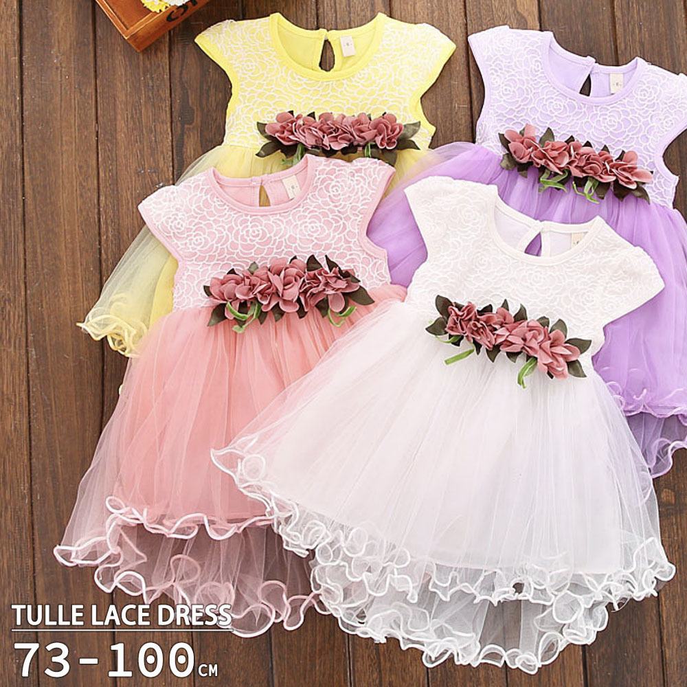 ワンピース 子供服 ノースリーブ フレンチスリーブ 丸首 ドレス キッズ ベビー チュールスカート シフォン 花飾り ウエストリボン 結婚式 発表会