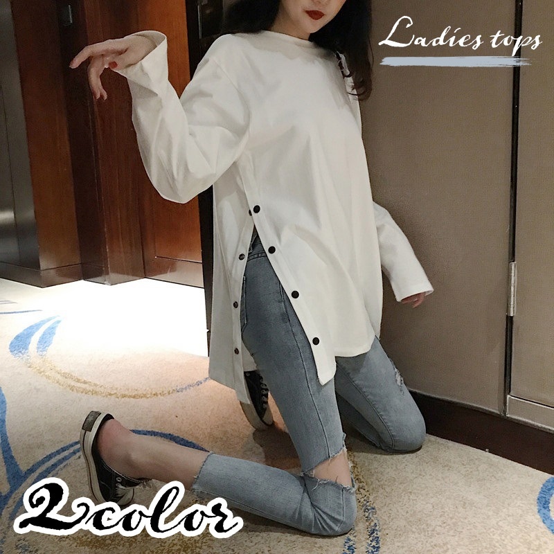 チュニック 長袖 レディース 女性 トップス Tシャツ カットソー サイドスリット ボートネック 飾りボタン 大きいサイズ 無地 単色 おしゃれ かわ