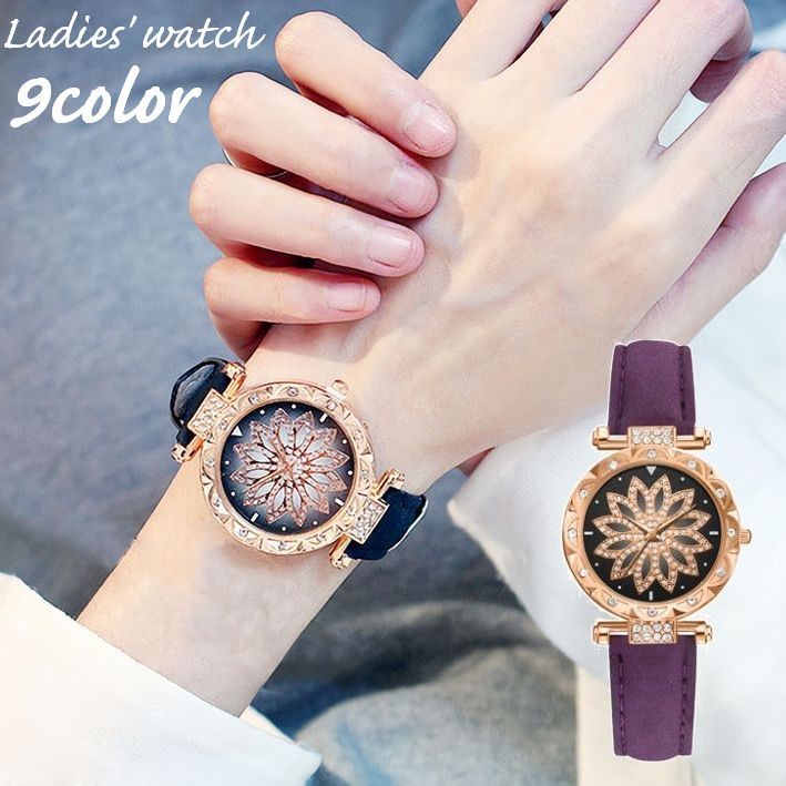 腕時計 リストウォッチ レディース 女性用 アナログ ラウンド 丸型 ラインストーン フラワー レザー調 キラキラ 上品 おしゃれ きれいめ エレガン