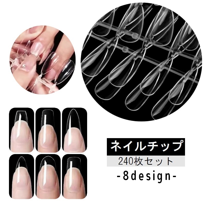 ネイルチップ 240枚セット つけ爪 サンプルチップ 透明 クリア マット つや消し ネイル用品 ネイルグッズ ロング ショート アーモンド型 オーバ