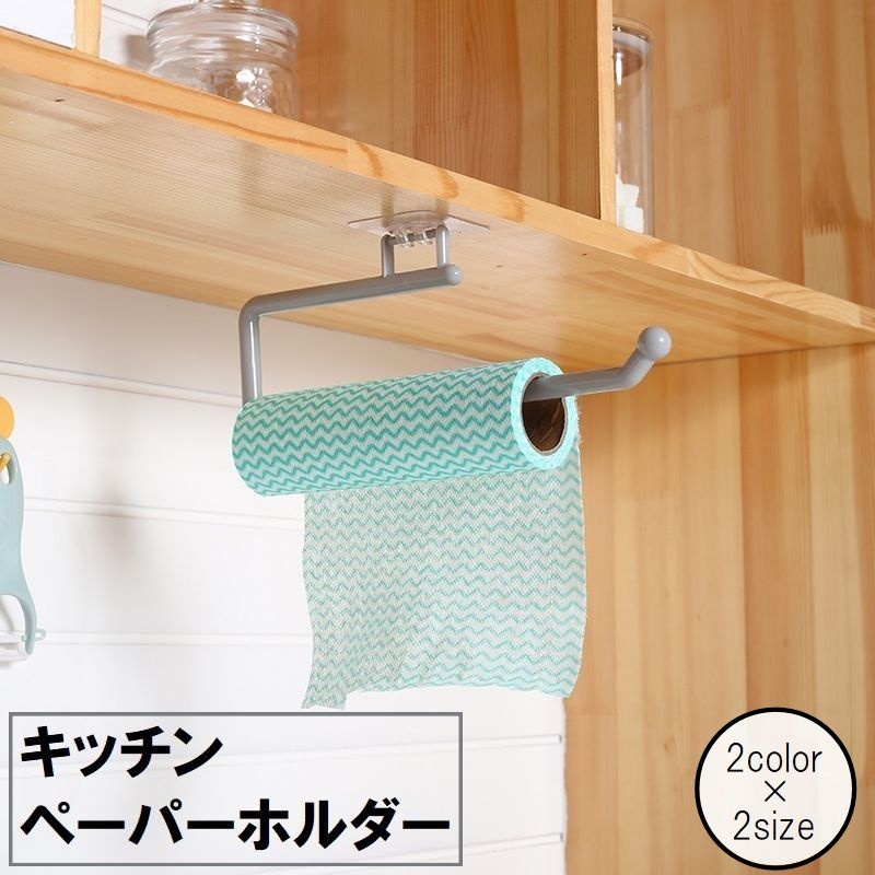 戸棚下や壁面に粘着テープで取り付けて便利に使えるキッチンペーパーホルダーです。