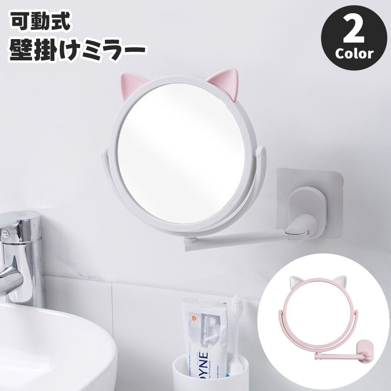 壁掛け鏡 ウォールミラー 可動式 アーム付き 折り畳み 角度調整可 スイングミラー アームミラー 猫 ネコ 猫耳 丸型 ラウンド インテリア 収納 日