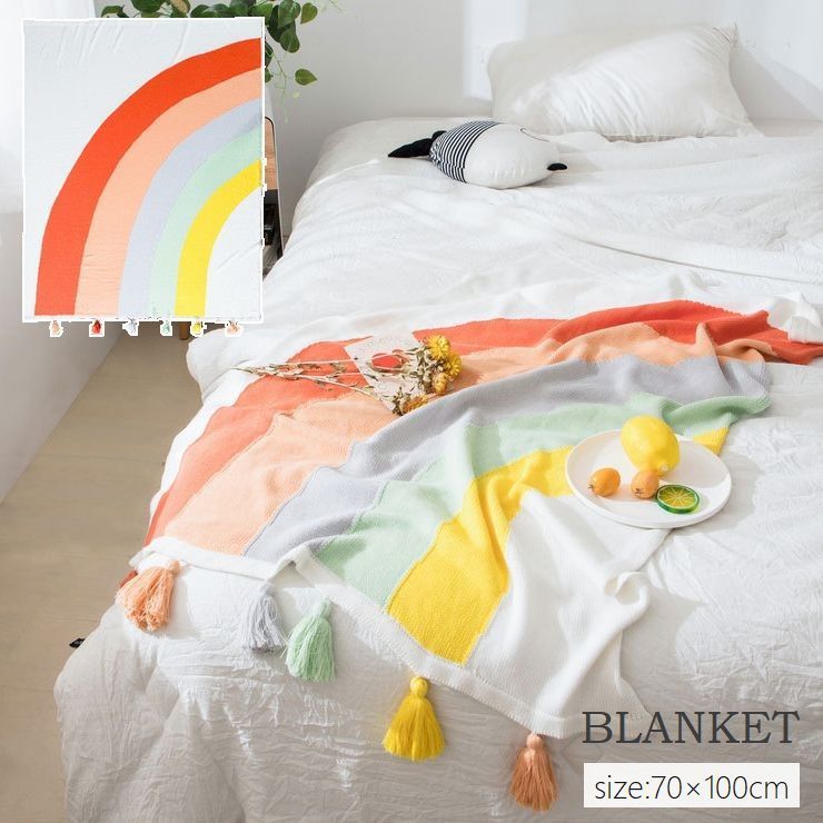 ブランケット 70 100cm ひざ掛け 掛け布団 ニット フリンジ付き 虹 レインボー カラフル お昼寝 子供 大人 おしゃれ かわいい
