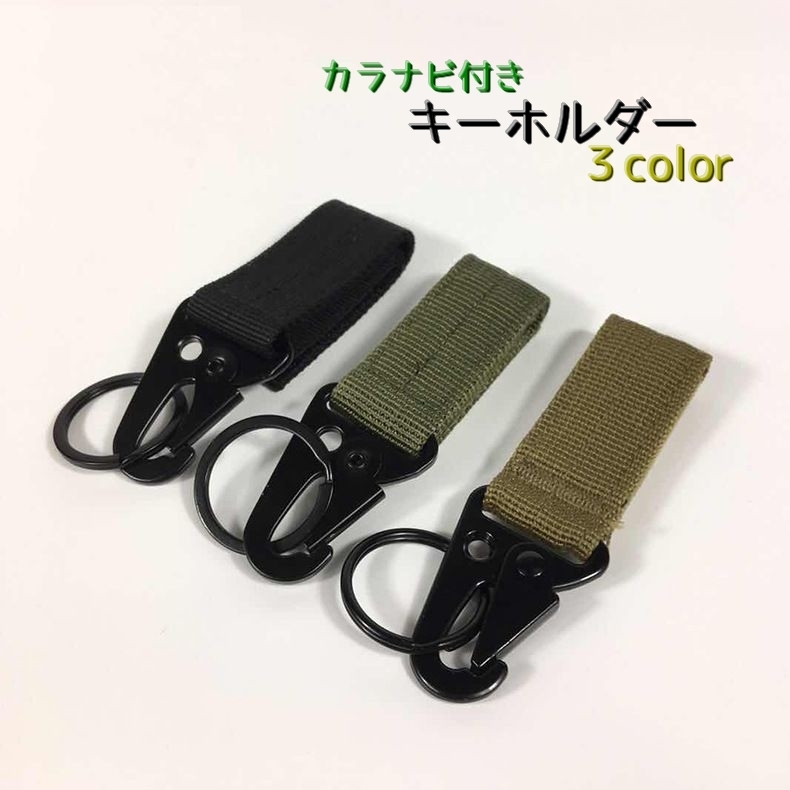 アウトドアなどで活躍するベルトにつけるキーホルダーカラナビ付きです。