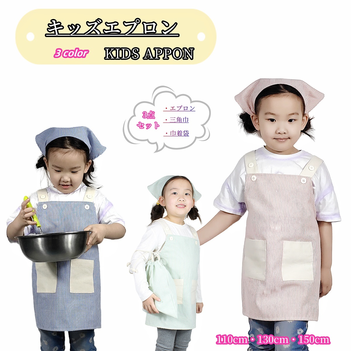 エプロン 三角巾付き 巾着袋 3点セット キッズ 子供エプロン ストライプ 小学生 調理実習 女の子 男の子 こども 子ども
