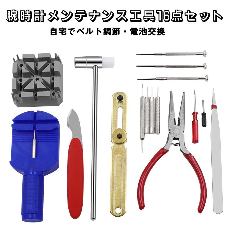 腕時計メンテナンス工具 修理 16点セット 16種類セット 工具セット メンテナンスセット ベルト調整 電池交換 裏蓋外し 閉め こじ開け器具 バネ棒