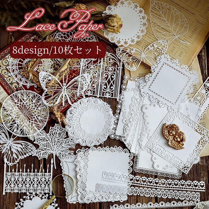 レースペーパー 10枚セット デコパージュ用品 コラージュ用品 デザインペーパー 透かし彫り 花 フラワー 蝶 葉っぱ リーフ 背景紙 素材紙 DIY
