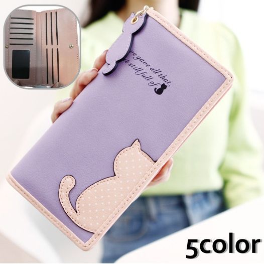 財布 長財布 ウォレット レディース 二つ折り カードケース ファスナー 小銭入れ 大容量 フェイクレザー チャーム付き 猫 シルエット ネコ キュー
