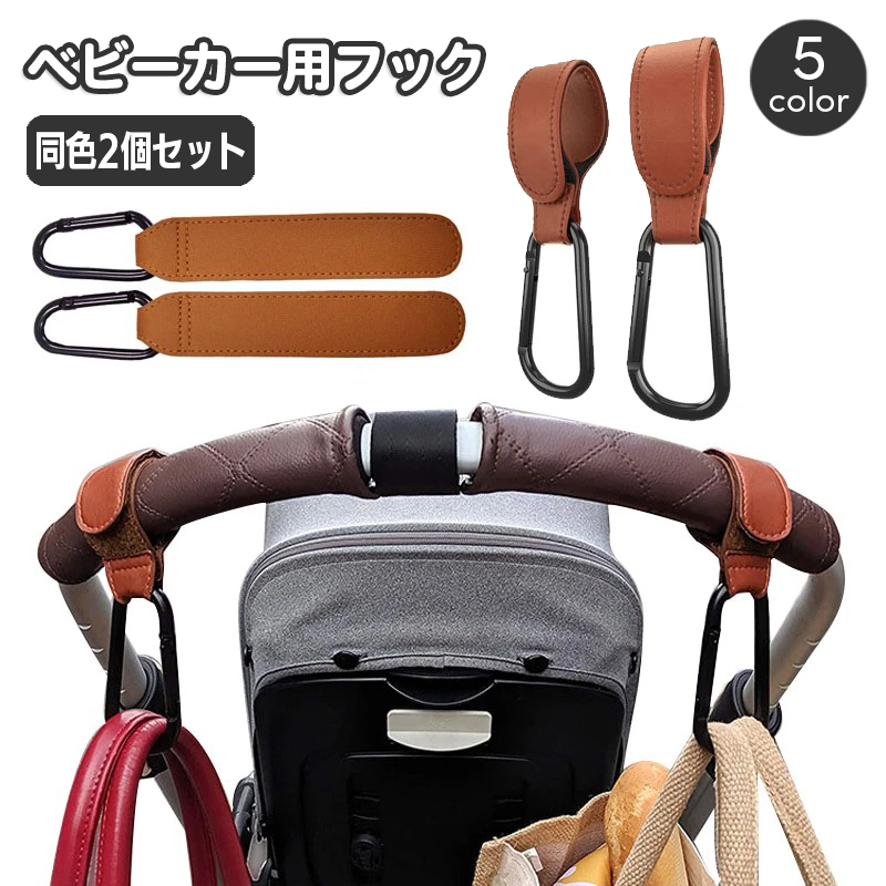 ベビーカー用フック 同色2個セット レザー調 荷物掛け 荷物フック バギーフック マルチフック カラビナ付き 面ファスナー 取り付け簡単 おしゃれ ス