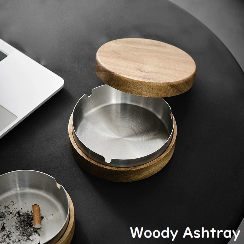 灰皿 アッシュトレイ ステンレス 木製の蓋付き フタ付き 飛び散り防止 卓上 喫煙具 吸い殻入れ 円形 丸型 大容量 インテリア
