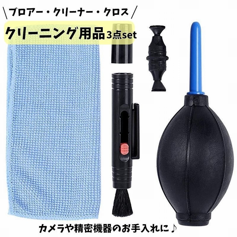 カメラのお掃除に便利な手動ブロアー、ペン型クリーナー、クロスのセットです。