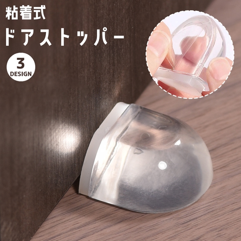 クリアカラーで目立ちにくい、粘着式のドアストッパーです。