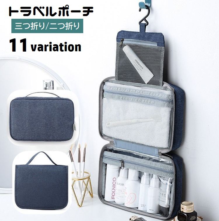 トラベルポーチ 三つ折り 二つ折り フック付き 吊り下げ 化粧ポーチ メイクポーチ コスメポーチ 旅行用品 折りたたみ 持ち手付き ファスナー メッシ