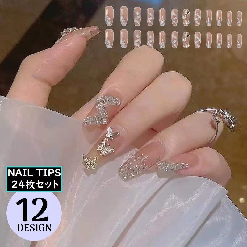 ネイルチップ つけ爪 24枚セット 12サイズ 貼るネイル ラインストーン ビジュー リボン ラメ キラキラ 可愛い おしゃれ