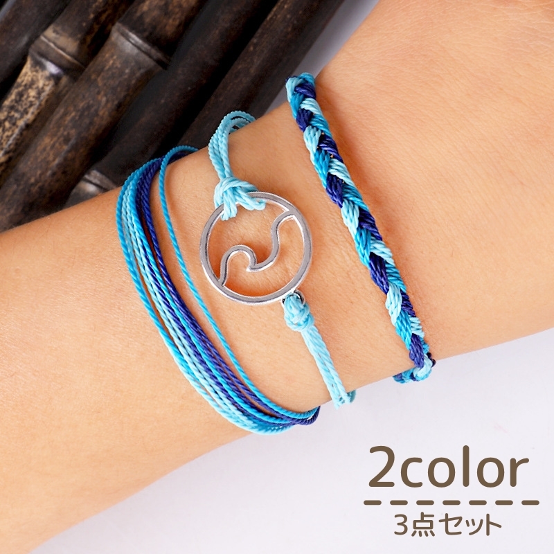 ブレスレット 3点セット アクセサリー 腕輪 ミサンガ風 男女兼用 ユニセックス レディース メンズ 調節可能 カジュアル 海 マリン 波 モチーフ