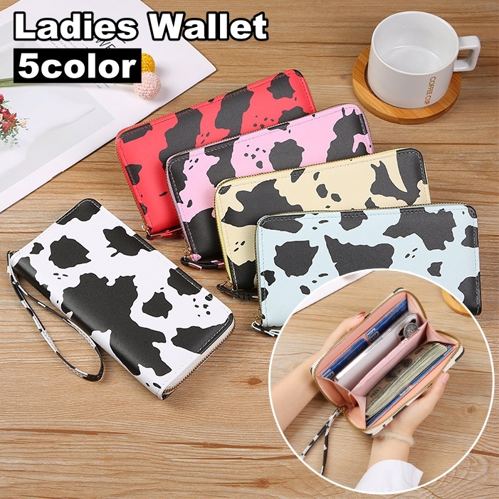 長財布 ロングウォレット レディース 女性 ラウンドファスナー ストラップ付き レザー調 大容量 カード収納 小銭入れ カード入れ ウシ柄 牛柄 お洒