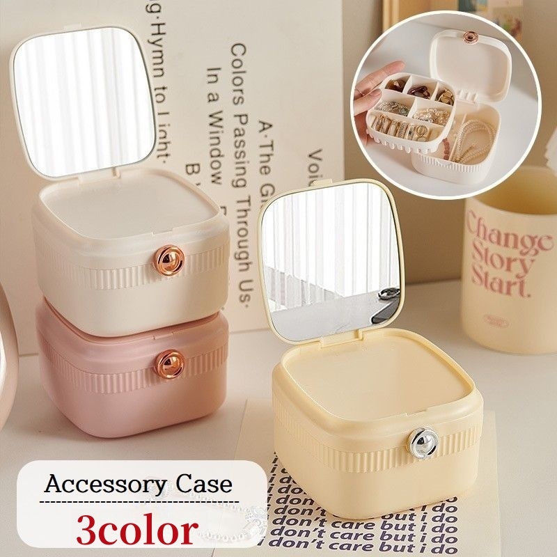 アクセサリーケース ジュエリーボックス 携帯用 鏡付き ミラー 2段 仕切り付き アクセサリー収納 小物入れ コンパクト 持ち歩き 四角形 ネックレス