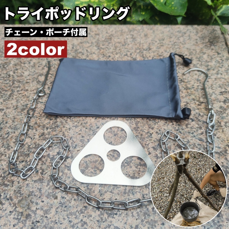 トライポッドリング チェーン ポーチ 3点セット 三脚作り 自作 焚き火台 フック付き トライポッド 枝木 簡単 リング 吊り下げ ファイヤースタンド