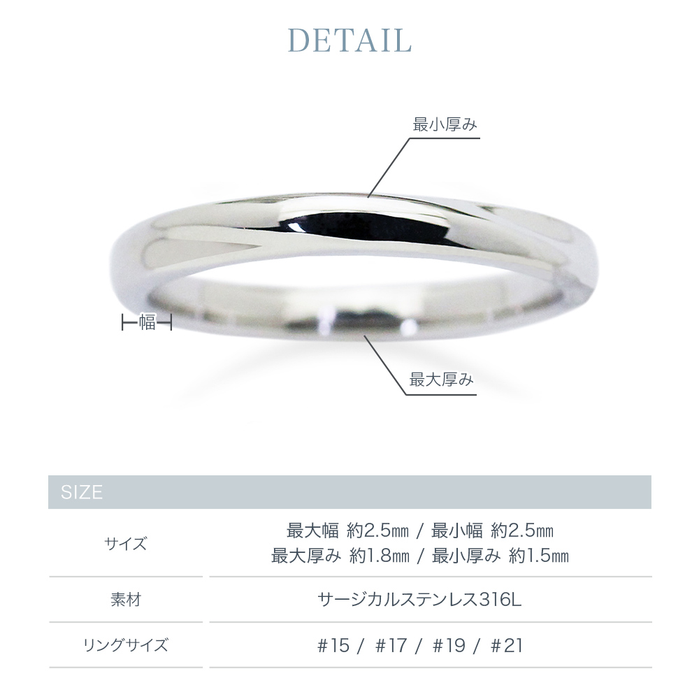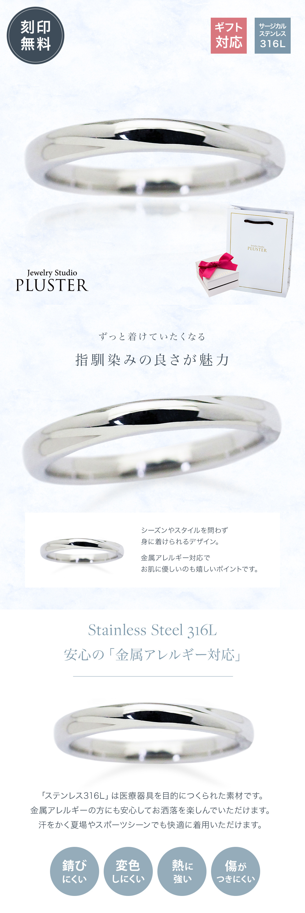 | | サージカルステンレス 「 ステンレス316L 」は、汗などに接触しても金属が溶け出しにくく、アレルギー反応を起こしにくい、「 金属アレルギー対応 」の肌に優しい素材です。インプラントなどの医療現場でも使われている素材です。ステンレスには必ず番号がありますので「 Stainless steel 316L 」など、番号が明記されている商品のご購入をおすすめします。 ”錆びにくく変色も少ない”ため、汗をかいてもかぶれない、かゆくならないことが多く、スポーツや「 つけっぱなし 」にされたい方にも人気で女性だけでなく男性にもおすすめです。" ノンアレルギー "対応の「 アレルギーフリーリング 」として、ジュエリースタジオ プラスターの【 フリーレーベルコレクション 】が好評を得ています。