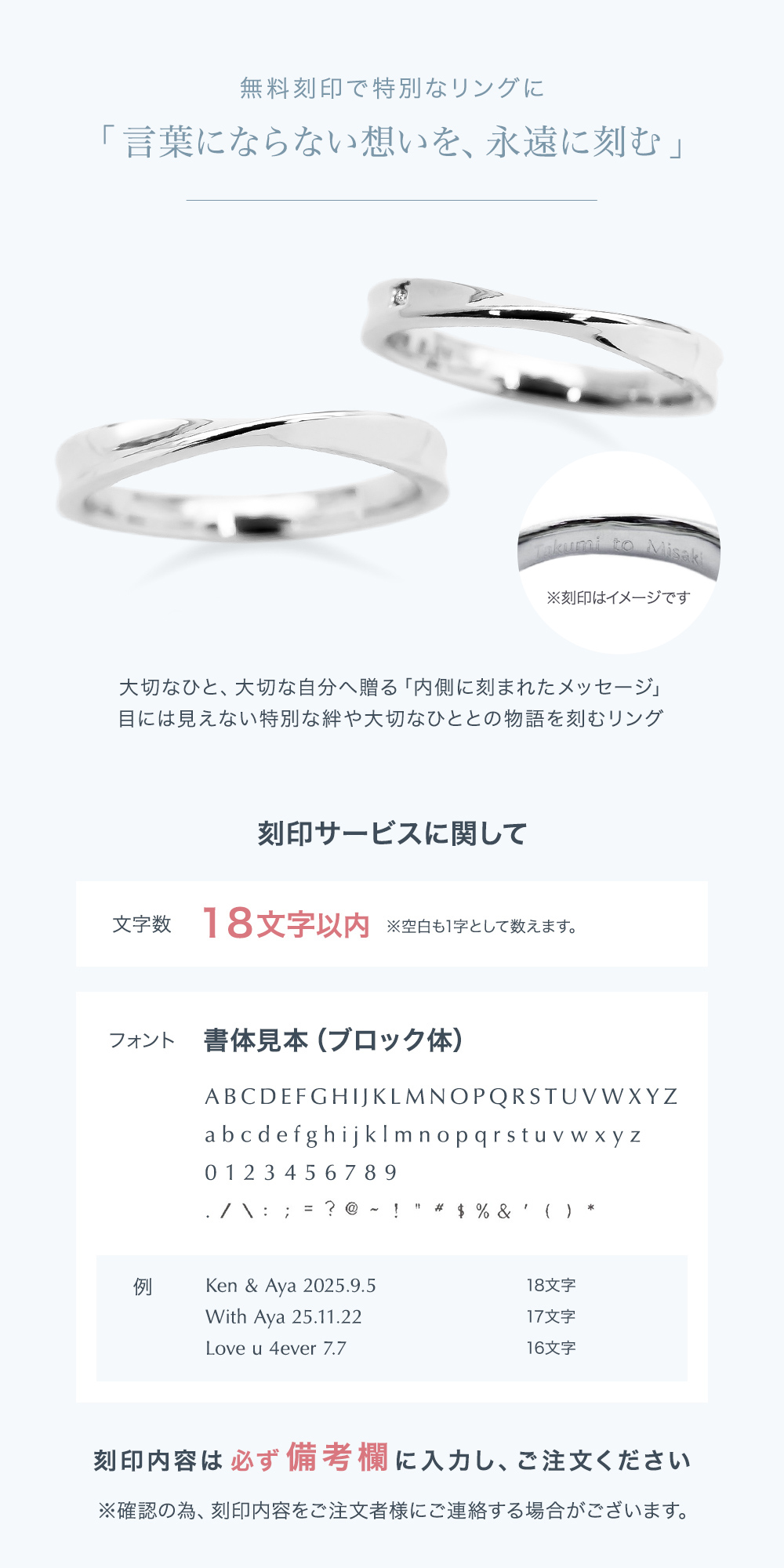 ※ペアでご購入のお客様は「男性用」「女性用」それぞれ刻印をご記載ください。