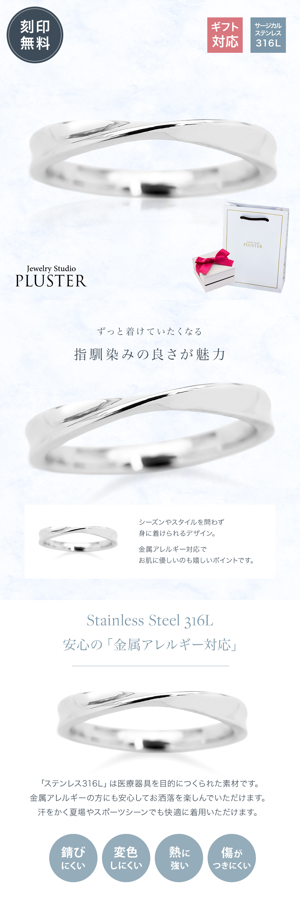 | | サージカルステンレス 「 ステンレス316L 」は、汗などに接触しても金属が溶け出しにくく、アレルギー反応を起こしにくい、「 金属アレルギー対応 」の肌に優しい素材です。インプラントなどの医療現場でも使われている素材です。ステンレスには必ず番号がありますので「 Stainless steel 316L 」など、番号が明記されている商品のご購入をおすすめします。 ”錆びにくく変色も少ない”ため、汗をかいてもかぶれない、かゆくならないことが多く、スポーツや「 つけっぱなし 」にされたい方にも人気で女性だけでなく男性にもおすすめです。" ノンアレルギー "対応の「 アレルギーフリーリング 」として、ジュエリースタジオ プラスターの【 フリーレーベルコレクション 】が好評を得ています。