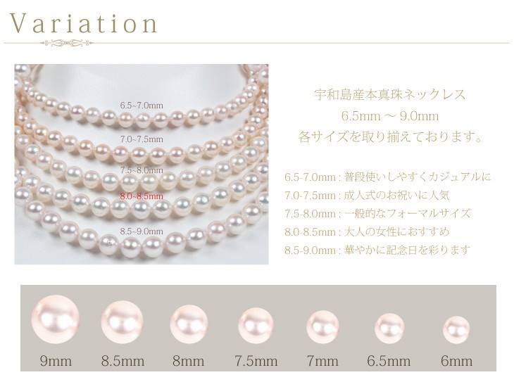 | ネックレススペック | 全長 42cm 珠の大きさ 8.0-8.5mm 素材 宇和島産真珠 留め具:SV925 |