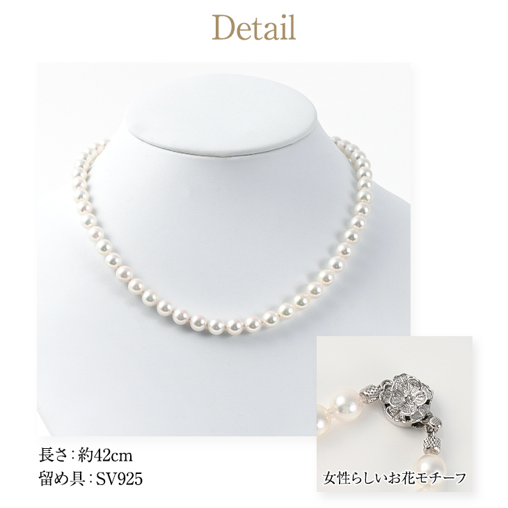 ネックレススペック | 全長 42cm 珠の大きさ 7.0-7.5mm 素材 宇和島産花珠真珠 留め具:SV925 |