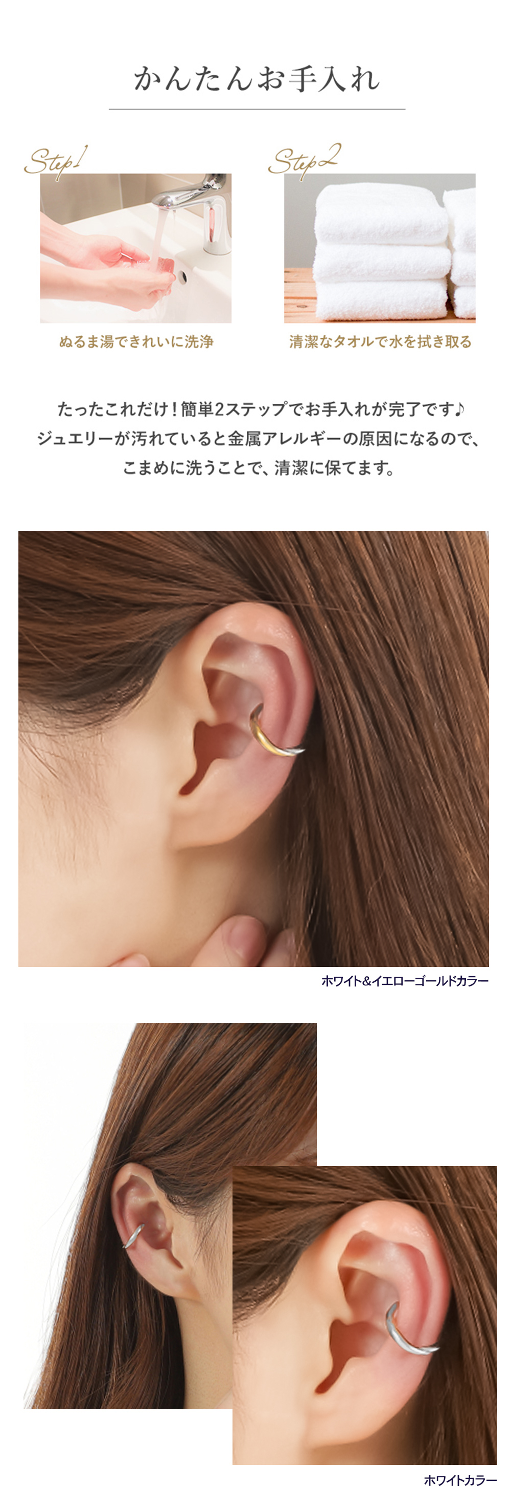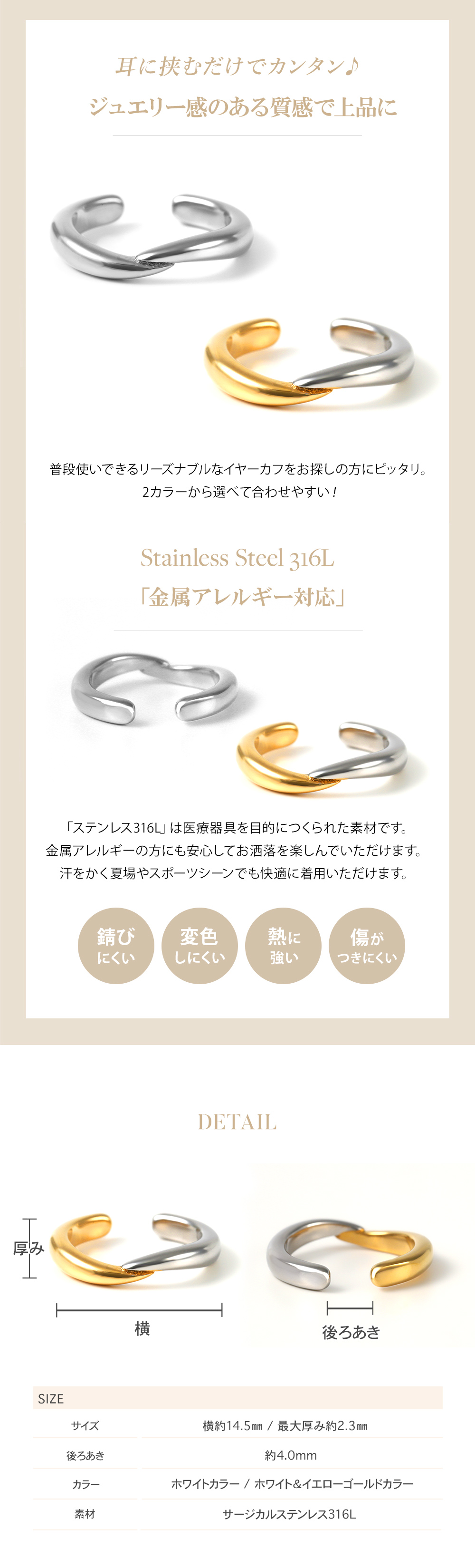 「 イヤーカフ 」は男女問わず ユニセックス で楽しめるジュエリーです。キャッチ不要で、どんな装いにも合う、万能アイテム。つけるだけで顔まわりのアクセントになるイヤーカフは、今年の「 トレンドアクセサリー 」の一つとして数えられるアイテム。「 ステンレス 316L 」は金属アレルギーに対応しているので、お肌に優しく安心です。