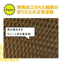 チェーンポットは紙製の鉢が チェーン状に連結した構造になっているので、そのまま紙製の鉢を引きだし、移植できるので作業が楽で省力的です。また紙製のため育苗中にポット同士で水や空気のやり取りを行い、そろった苗が作りやすくなります。
