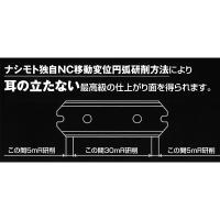 他社の替刃は刃部が直線状になっており、耳や筋が立ちやすいが越翁は独自NC移動変位円弧研削法により耳の立たない最高級仕上がり面を保証!