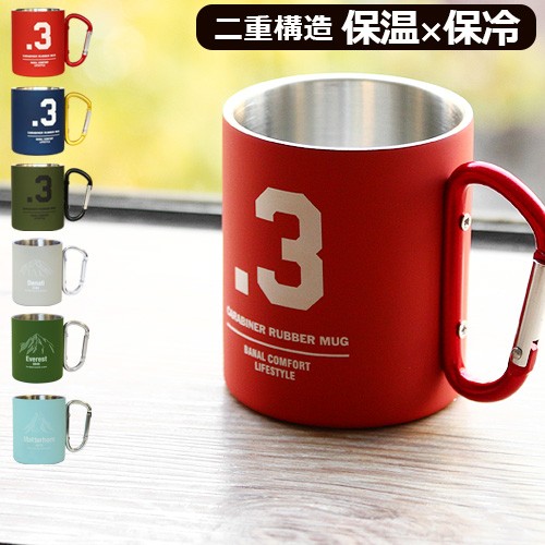 ラバーコーティングがされたステンレスマグ。ステンレスは錆びにくく軽量なので、お手入れもらくらく。さらに、ステンレスがダブルウォール構造(二重構造)になっているので、外気による温度変化を防ぎ、温かい飲み物は温かく、冷たい飲み物は冷く、長い時間温度を保つことができます。取っ手がカラビナになっているので、カバンのループにつけて持ち運ぶのも簡単!キャンプやピクニックなど、アウトドアのお供にオススメです。カラビナのカラーとマグにプリントされたデザインがコーディネートのアクセントになるので無造作に付けているだけで様になります。