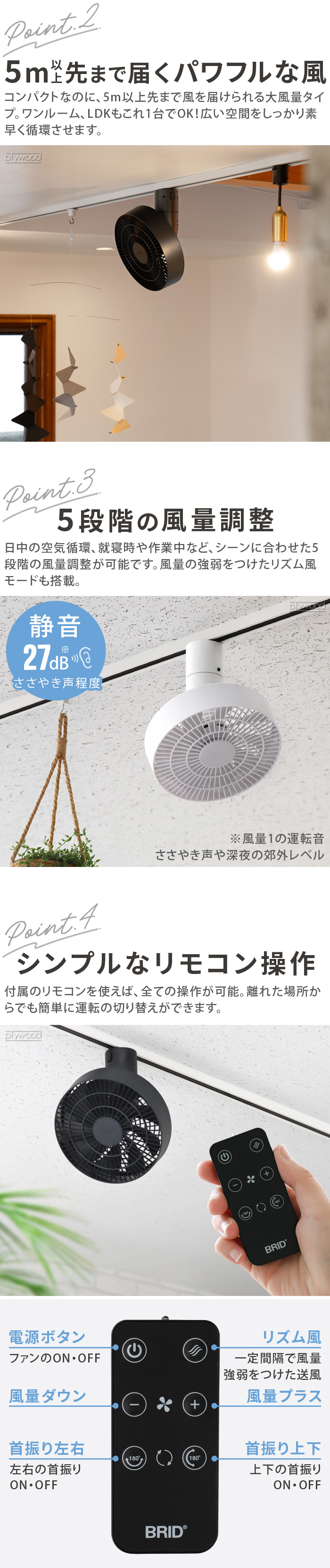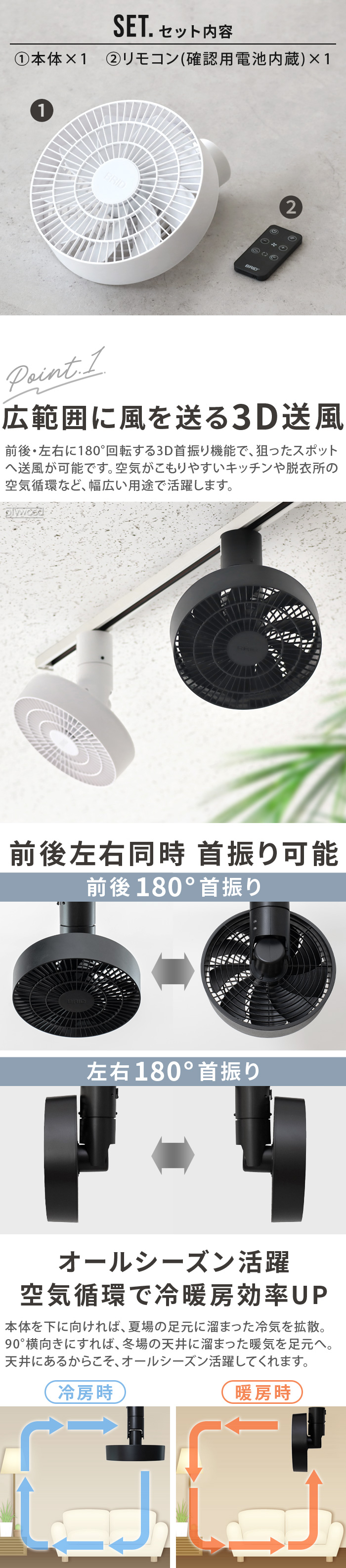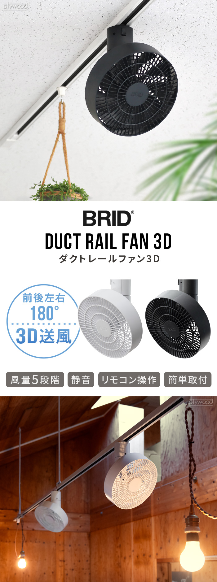パワフルな風で空気循環 3D送風 ダクトレールファン 従来のダクトレールファンと比べてより立体的に空気を循環させる機能を搭載した「DUCT RAIL FAN 3D」の登場です。付属のリモコンで前後・左右の風向調整ができます。5m以上先まで届くパワフルな風で、キッチンやお部屋の隅など空気が溜まりやすい環境でも大活躍。空間に自然に馴染む、スッキリとしたデザインです。 |