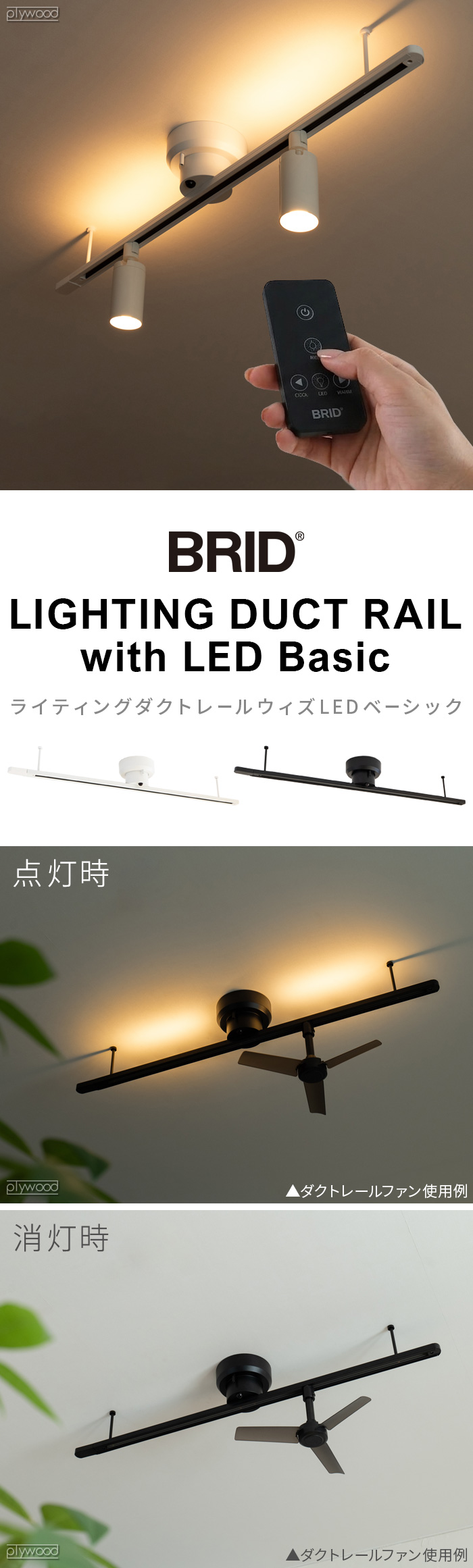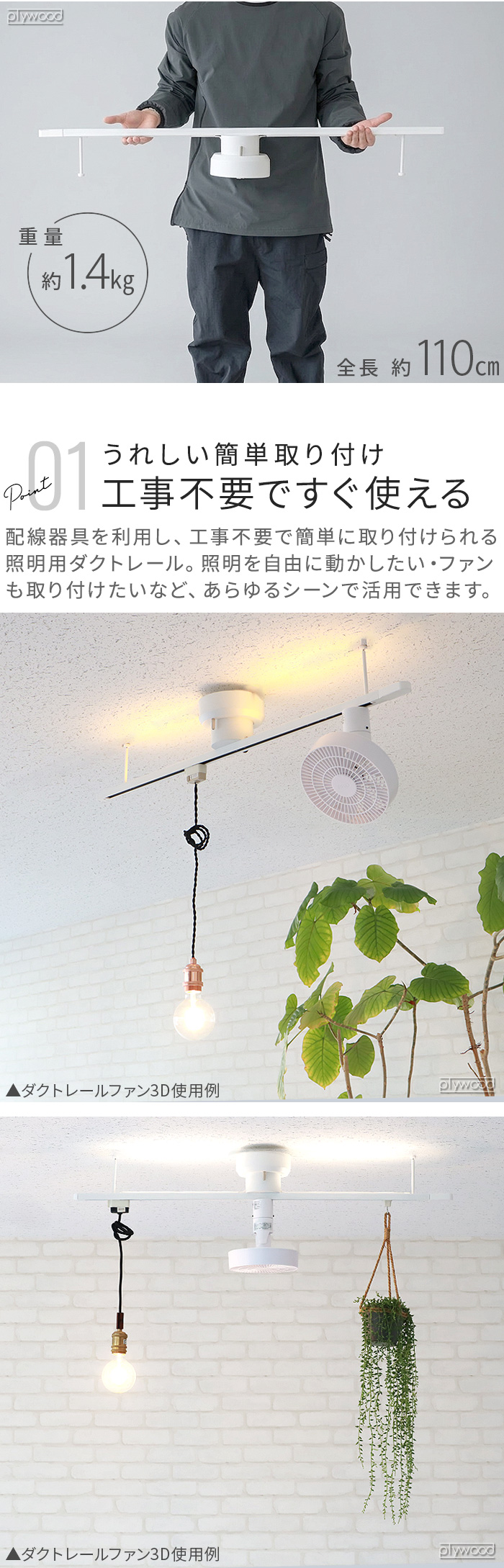 | 器具を取り付ける天井の強度を確認し、重量に耐える場所に確実に行ってください。強度が不足している場合は補強工事をしてから取付けてください。器具落下によるケガの原因になります。 器具や電球を布や紙、アルミ箔で覆って使用しないでください。 落下防止の為、各パーツが確実に接続されているか再度点検の上ご使用ください。 照明やレールファンなどは別売りです。 |