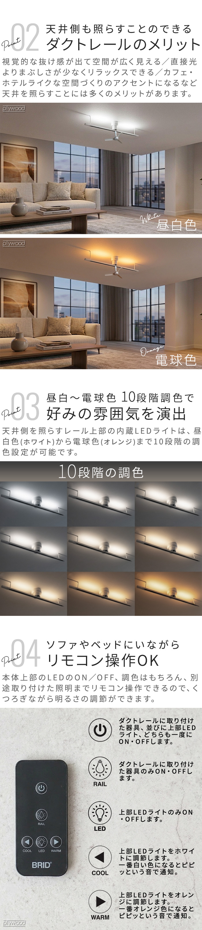 | 600Wまで使用可 調色10段階(電球色-昼白色) 上部LEDライト付き(LEDライト単体使用可能) 上部LEDライトは、消灯前に点灯していた色を記憶する機能付き。 テスト用電池が付属されています。電池切れの場合はCR2025をお買い求めください。 取り付けには埋込ローゼット、角形引掛シーリング、丸型引掛シーリングのいずれかの配線器具が必要です。ついていない場合は、電気工事店に依頼し取り付けてください。 |