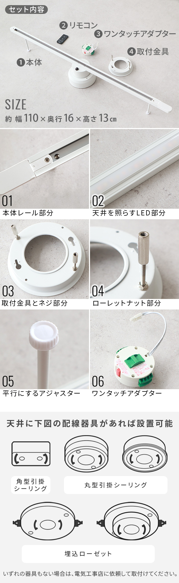 | 本体:(約)幅110×奥行16×高さ13cm バーサイズ:(約)幅110×奥行5×高さ2.5cm (照明取り付け可能幅100cm) |