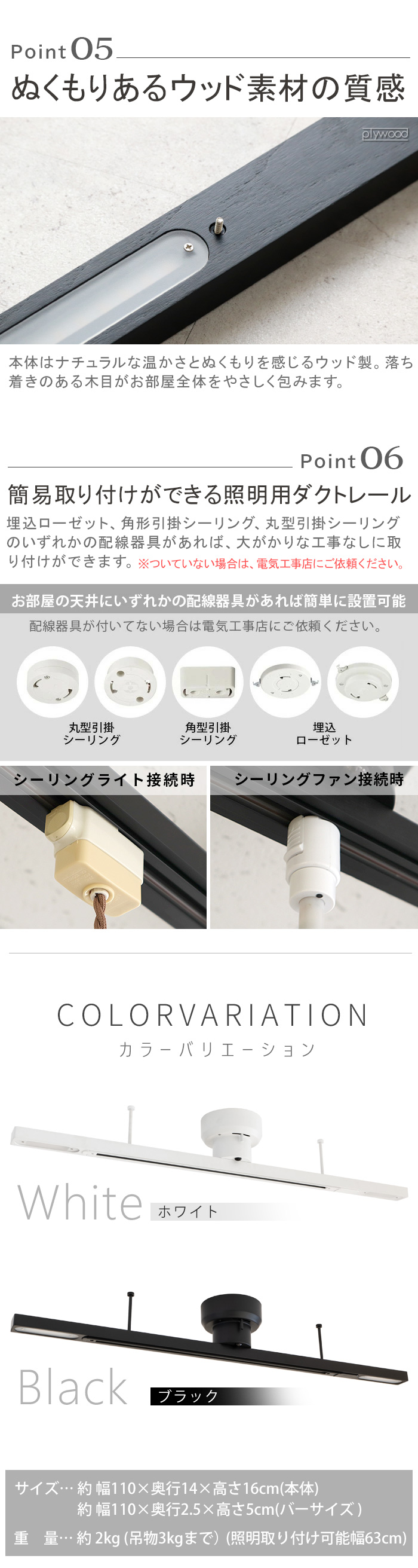 | 本体:(約)幅110×奥行14×高さ16cm バーサイズ:(約)幅110×奥行2.5×高さ5cm (照明取り付け可能幅63.7cm) |