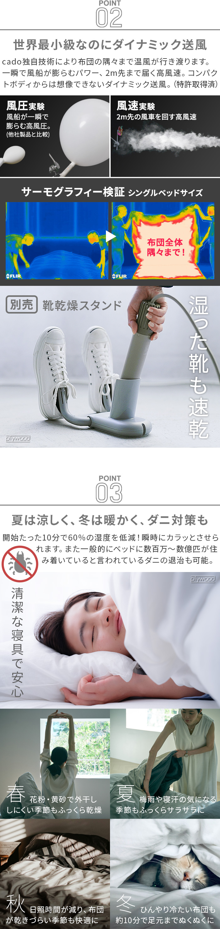 | ふとんの耐熱温度が70℃以上であることを確認してください。 特に機能性寝具( 低反発や高反発素材・ビーズ素材・パイプまくらなど)は温風の温度により機能を損なうことがありますので、必ず寝具メーカーに確認してください。 |