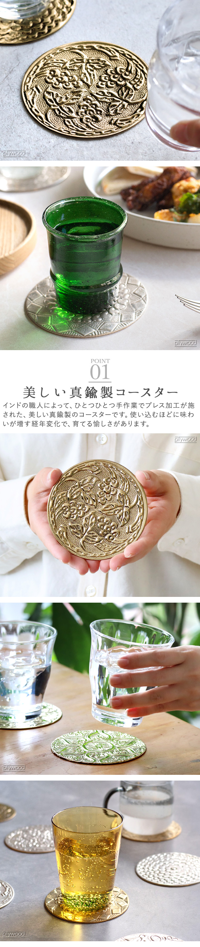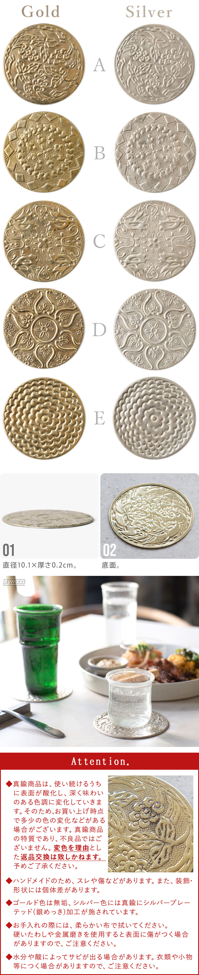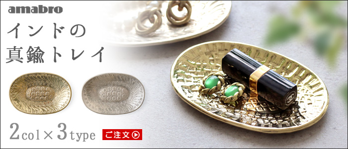 | 真鍮商品は、使い続けるうちに表面が酸化し、深く味わいのある色調に変化していきます。そのため、お買い上げ時点で多少の色の変化などがある場合がございます。真鍮商品の特質であり、不良品ではございません。変色を理由とした返品交換は致しかねます。予めご了承ください。 ハンドメイドのため、スレや傷などがあります。また、装飾・形状には個体差があります。 ゴールド色は無垢、シルバー色には真鍮にシルバープレーテッド(銀めっき)加工が施されています。 お手入れの際には、柔らかい布で拭いてください。硬いたわしや金属磨きを使用すると表面に傷がつく場合がありますので、ご注意ください。 水分や酸によってサビが出る場合があります。衣類や小物等につく場合がありますので、ご注意ください。 |