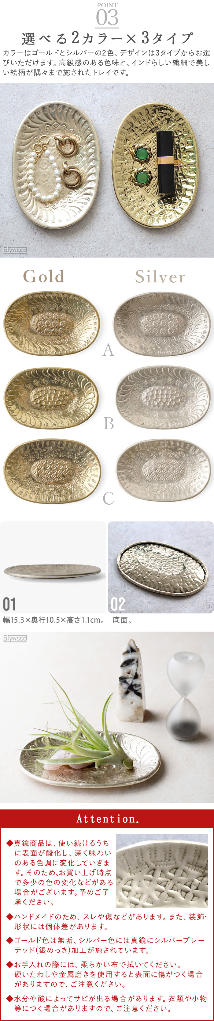 | 真鍮商品は、使い続けるうちに表面が酸化し、深く味わいのある色調に変化していきます。そのため、お買い上げ時点で多少の色の変化などがある場合がございます。真鍮商品の特質であり、不良品ではございません。変色を理由とした返品交換は致しかねます。予めご了承ください。 ハンドメイドのため、スレや傷などがあります。また、装飾・形状には個体差があります。 ゴールド色は無垢、シルバー色には真鍮にシルバープレーテッド(銀めっき)加工が施されています。 お手入れの際には、柔らかい布で拭いてください。硬いたわしや金属磨きを使用すると表面に傷がつく場合がありますので、ご注意ください。 水分や酸によってサビが出る場合があります。衣類や小物等につく場合がありますので、ご注意ください。 |
