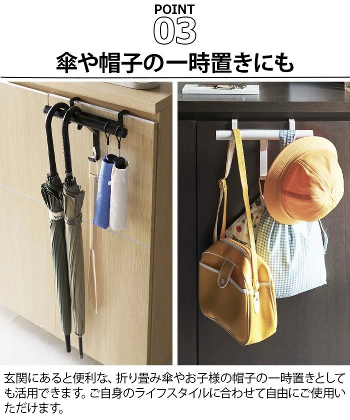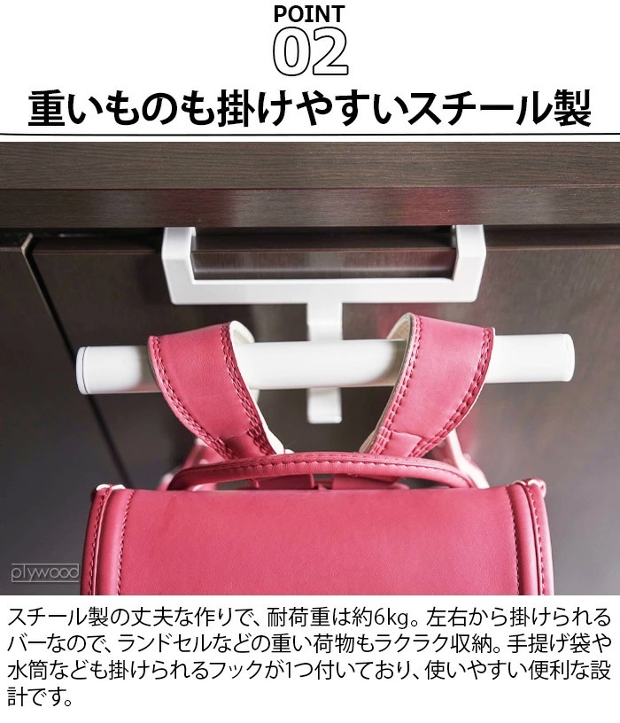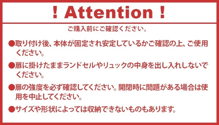 | 取り付け後、本体が固定され安定しているかご確認の上、ご使用ください。 扉に掛けたままランドセルやリュックの中身を出し入れしないでください。 扉の強度を必ず確認してください。開閉時に問題がある場合は使用を中止してください。 サイズや形状によっては収納出来ないものもあります。 扉の素材によってはランドセルやリュックなどの金具部分に接触しキズがつく場合があります。その場合は使用を中止してください。 |