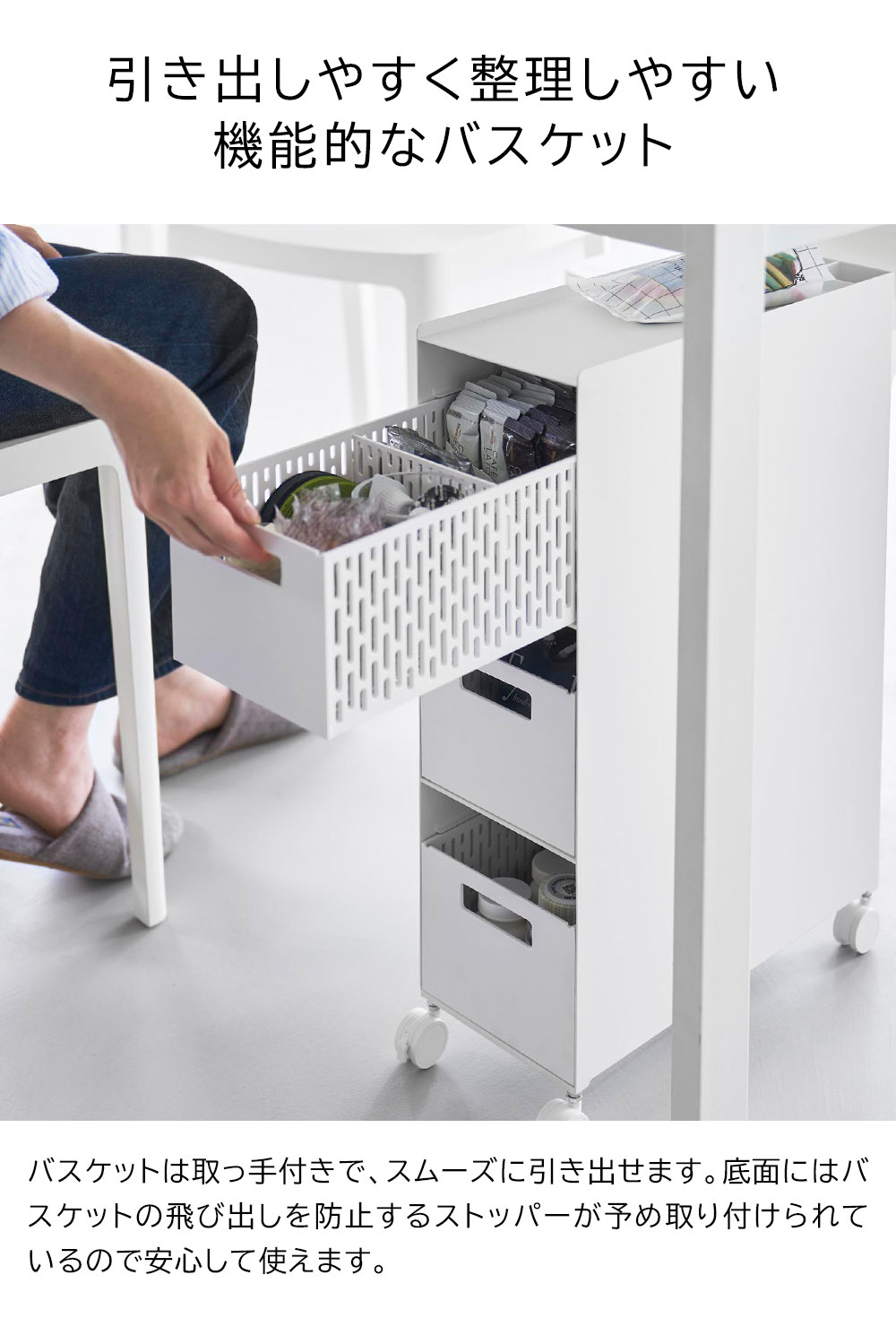 | 本体:(約)幅16.6×奥行43×高さ58cm バスケット:(約)幅15.3×奥行32.1×高さ12.2cm(1つあたり) バスケット1つあたり内寸:(約)幅14.5×奥行31.5×高さ11.5cm(仕切り板含まず) |